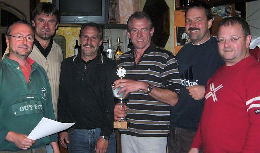 Unser Bild zeigt Hufeisenleiter Jakob Kern, Pokalspender Konrad Wittmann sowie die siegreiche Mannschaft mit Willi Kobler, Moar Hans Brummer, Christian Edmeier und Hermann Huber.
